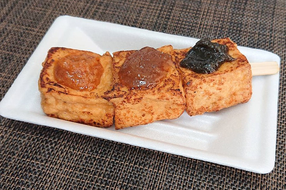 ばんげ田楽(八二醸造の田楽味噌、大竹豆腐店の厚揚げ使用)/新米焼き味噌おにぎり/やきとり/甘酒/フライドポテト/ソフトドリンク